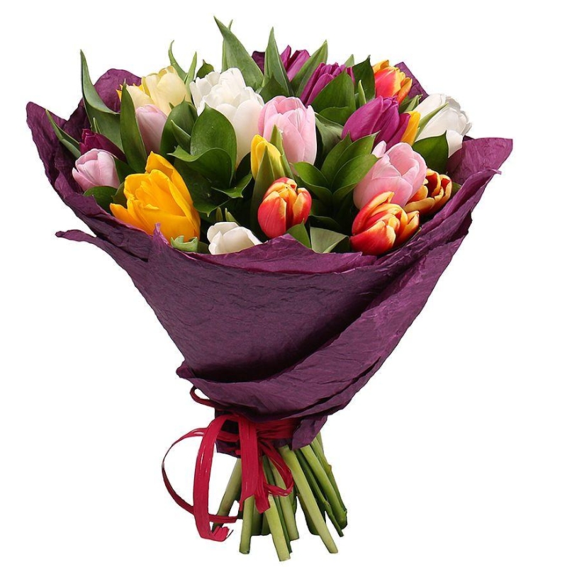 Букет состоит из MIX из 21 тюльпана, зелень, красивая упаковка, атласная лента.