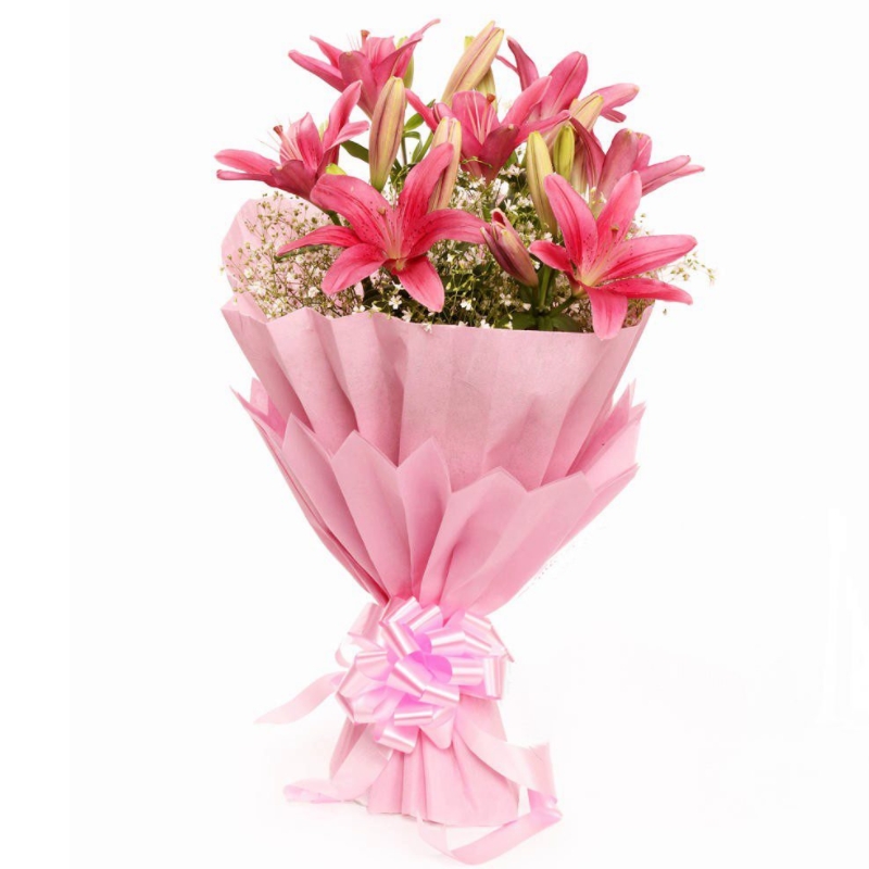 Букет состоит из 5 розовых лилий, 4 гипсофила, красивая упаковка, атласная лента.