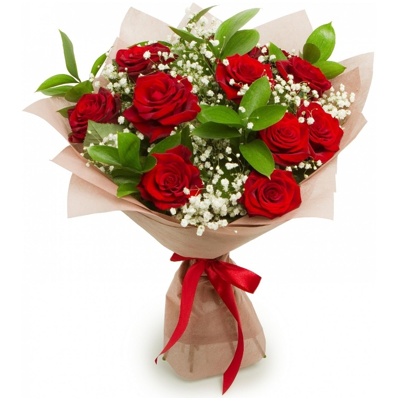 Букет состоит из 11 красных роз, 2 ветки гипсофилы, зелень, крафт, атласная лента.