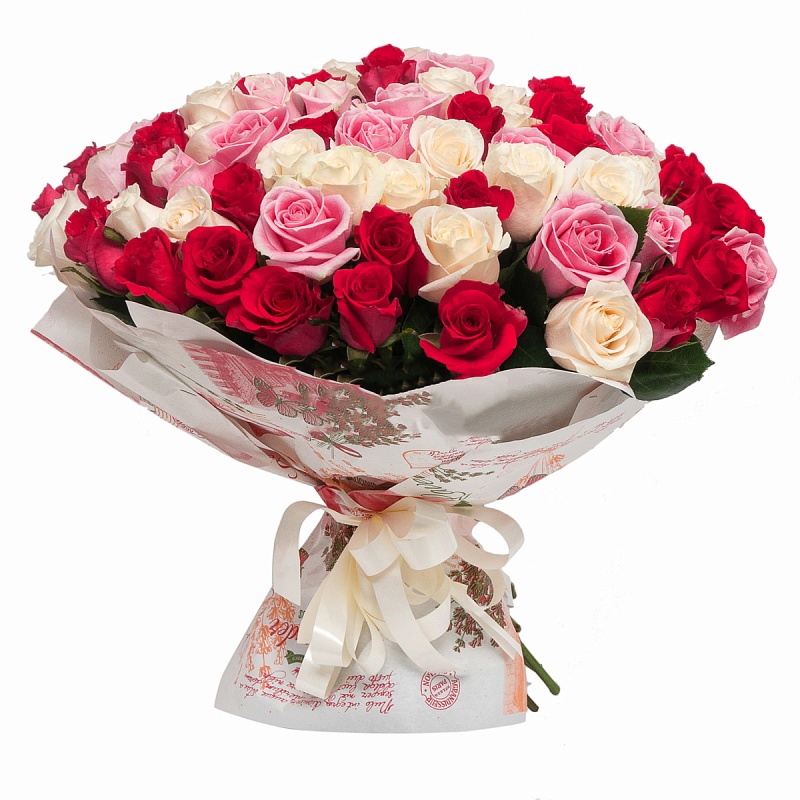 Букет состоит из MIX из красной / белой и розовой розы, красивая упаковка.
