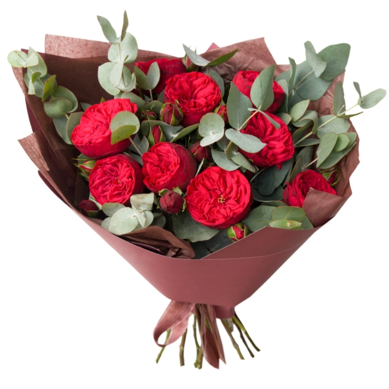 Букет состоит из 9 красных кустовых пионовидных роз, эвкалипт, упаковка, лента.